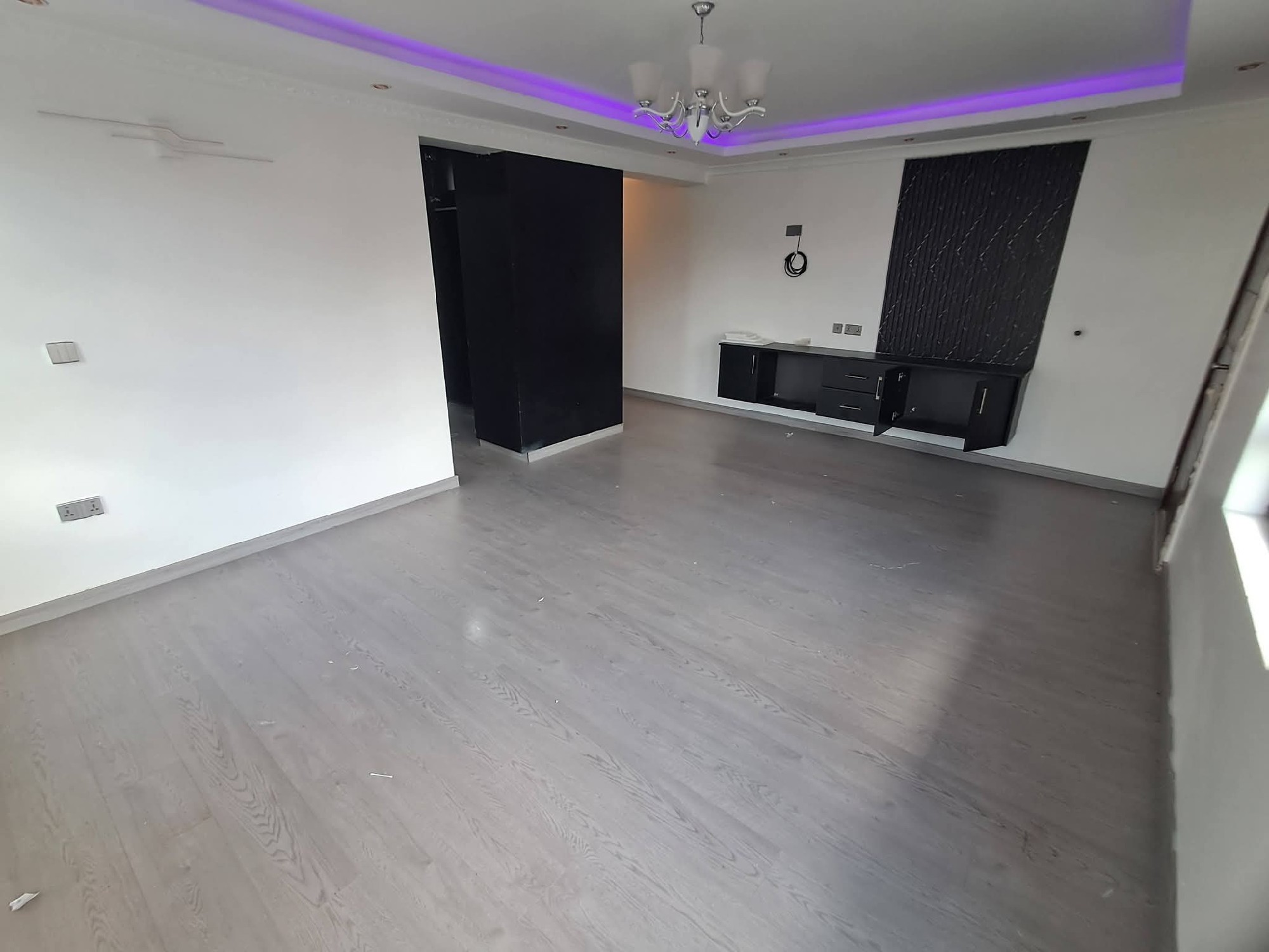 – Spacious lounge filled with natural light from the full length windows with beautifully designed chandeliers, gypsum ceiling, fitted curtain rods and custom paste on the walls.